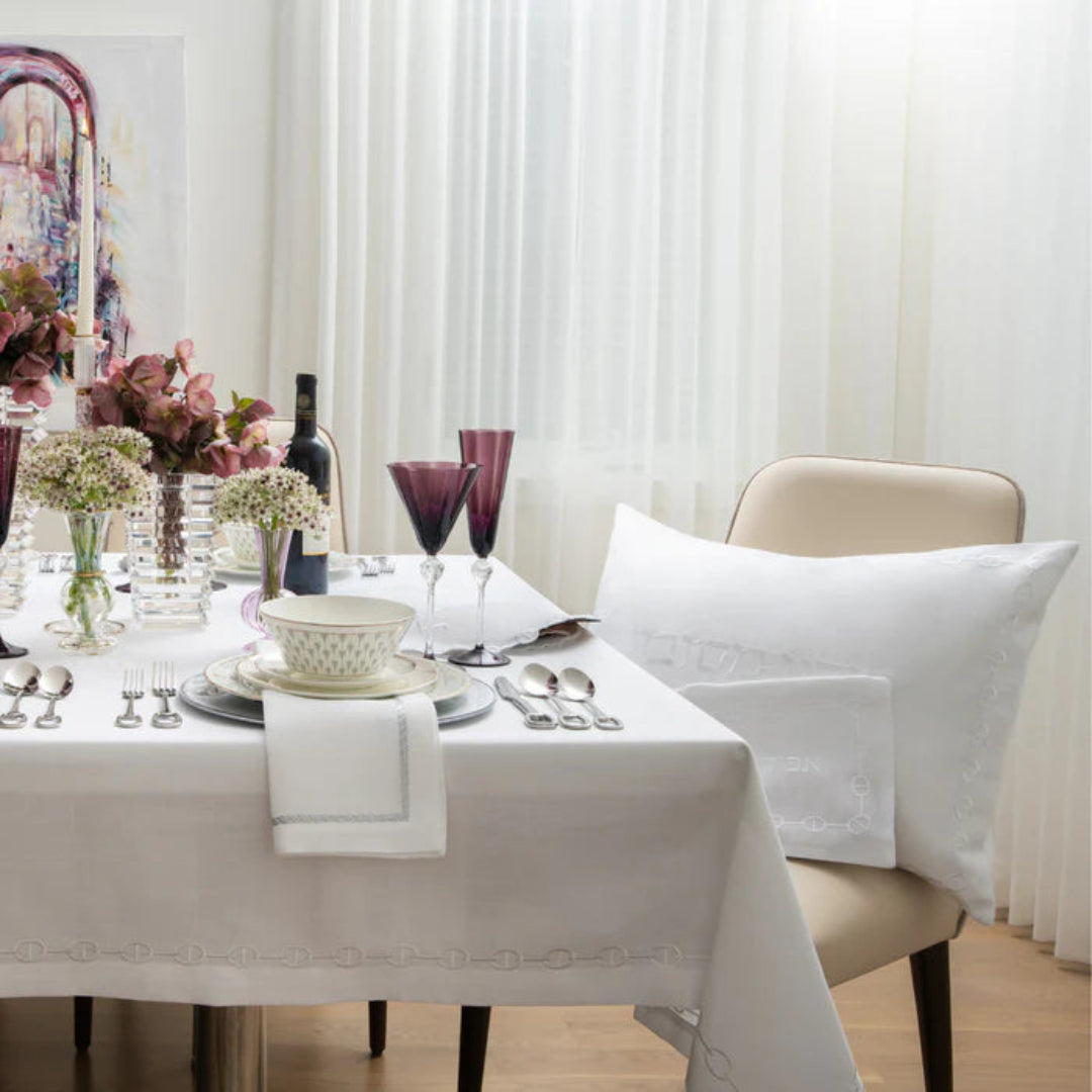 Set your table with this elegant and practical chain link tablecloth.White on white delicate embroidery in iconic chain link design.
