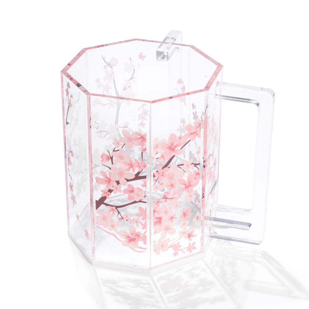 This stunning Lucite Washing Cup features luxury thick lucite, two easy-pour handles, a hexagon clear design with pink cherry blossoms throughout, and 4 rubber bases to ensure a sturdy and non-slip baseEnjoy class and style, yet still see the contents of your washing cup. 100% perfect according to Halacha, as this design does not have a spout and includes two handles.