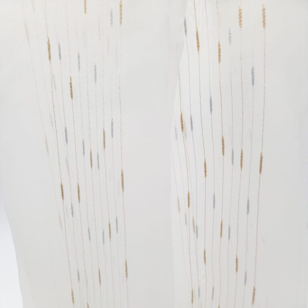 A silky smooth fabric consisting of streaks of thin white lines and a repeating pattern of gold and silver rows with woven coils randomly dispersed .
